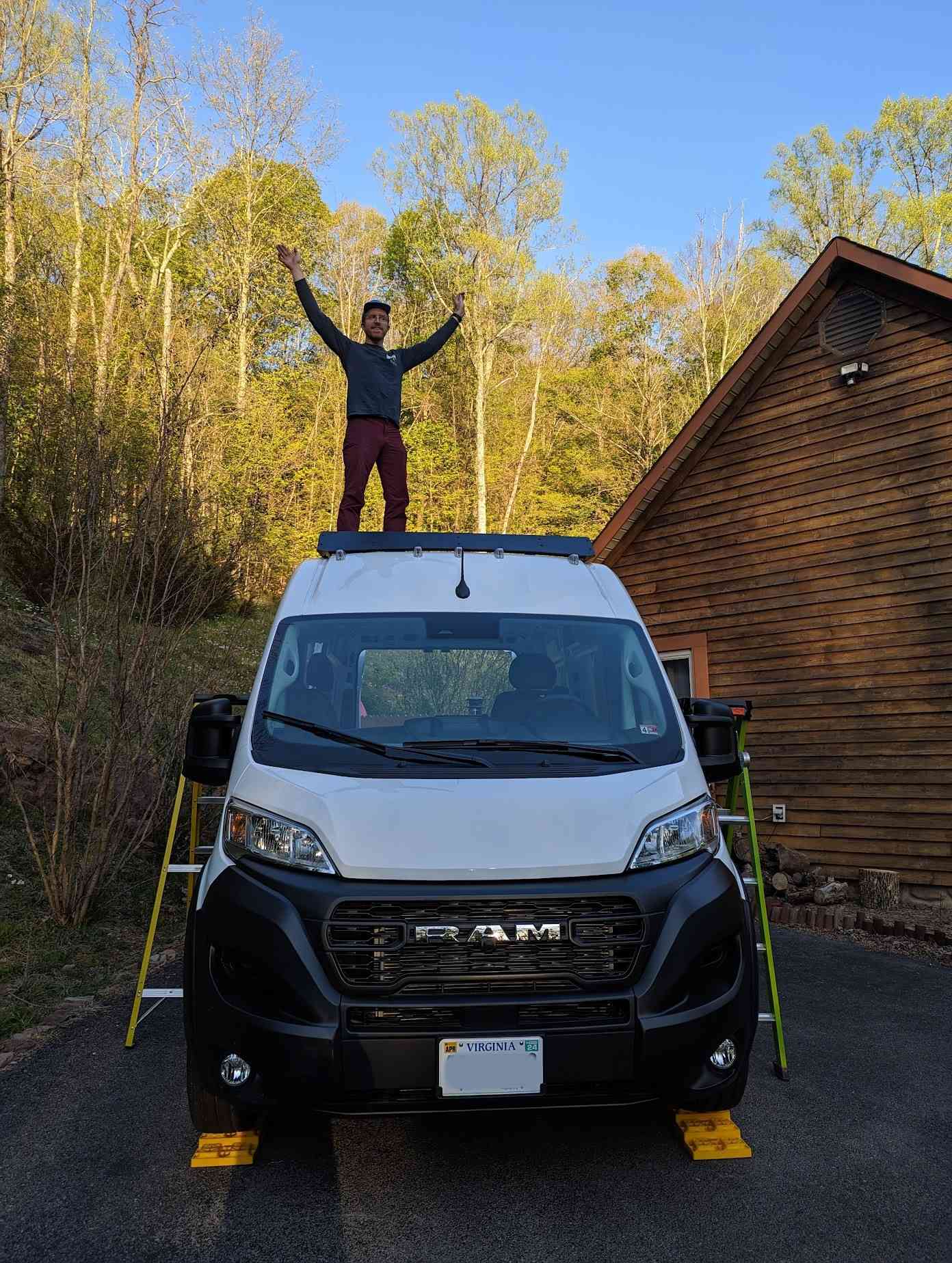 Stand triumphantly on van, arms raised, smile, look at camera: